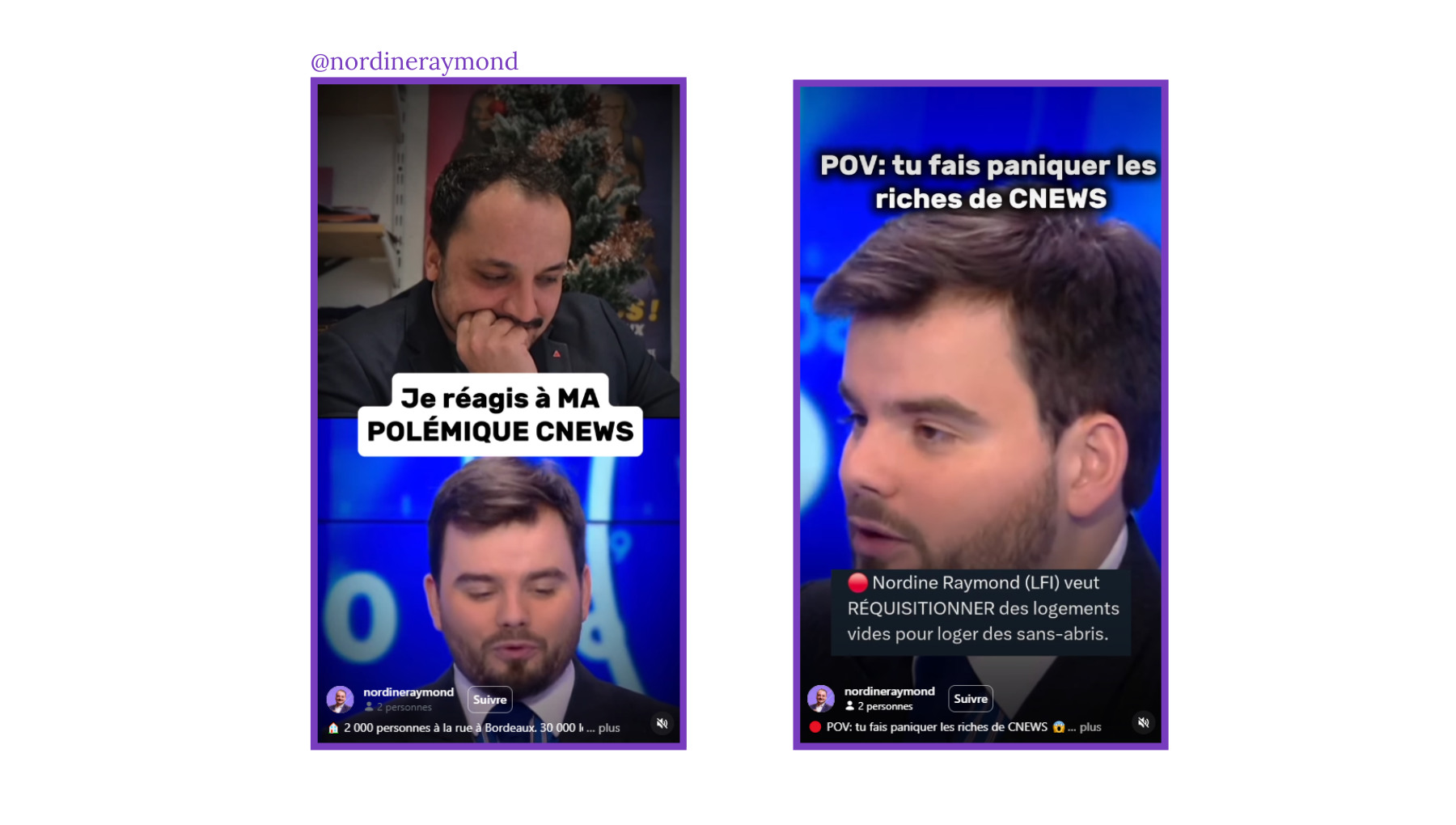 @nordineraymond suscite davantage de vues avec des formats empreints d’ironie, dans lesquels il revient sur des polémiques nées sur des plateaux télé. C’est le cas notamment d’une vidéo (248 K vues) où il reprend les codes des streamers pour commenter une émission de CNews au cours de laquelle des journalistes évoquent avec dédain sa proposition de réquisitionner les logements vacants. La logique est ici celle de la riposte médiatique et du format react (comme nous l’évoquions ici dans SocialRama), un registre qui circule particulièrement bien sur les plateformes.