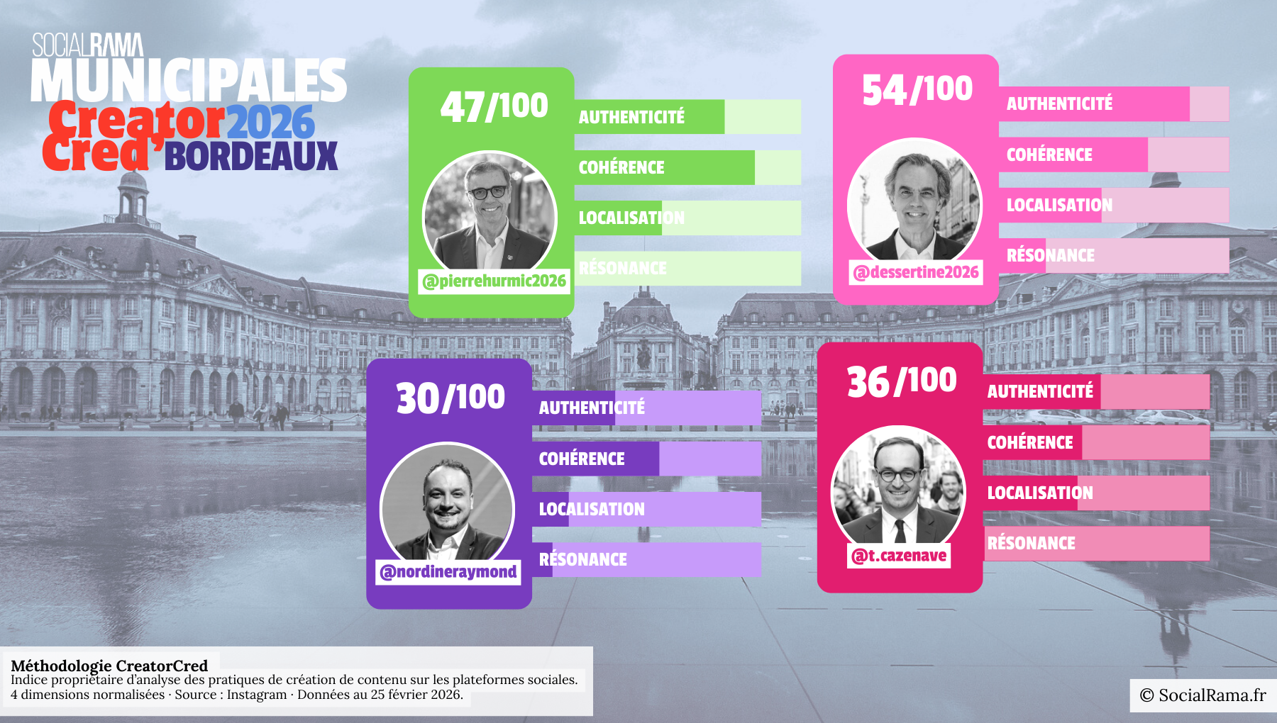 Pour cette analyse bordelaise, nous avons retenu les quatre candidats dont l’activité sur Instagram permet d’observer une véritable stratégie de création de contenu, au regard de leur nombre d’abonnés et du volume de publications vidéo disponibles sur la plateforme. Ces quatre candidats font également partie de ceux qui arrivent en tête des intentions de vote dans les principaux sondages publiés à ce stade de la campagne : le maire sortant @pierrehurmic2026 (1 747 abonnés), @t.cazenave (6 025 abonnés), @nordineraymond (3 015 abonnés) et @dessertine2026 (3 452 abonnés).