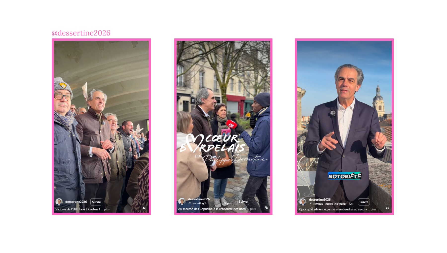 @dessertine2026 met en scène des commerçants du quartier Saint-Paul, des habitants des Capucins, des supporters de rugby et des acteurs économiques. Il associe régulièrement son image à des figures identifiées du territoire. Cette stratégie donne au compte une dimension très locale : marchés, commerces et rencontres deviennent des scènes récurrentes qui ancrent la campagne dans la vie quotidienne bordelaise.