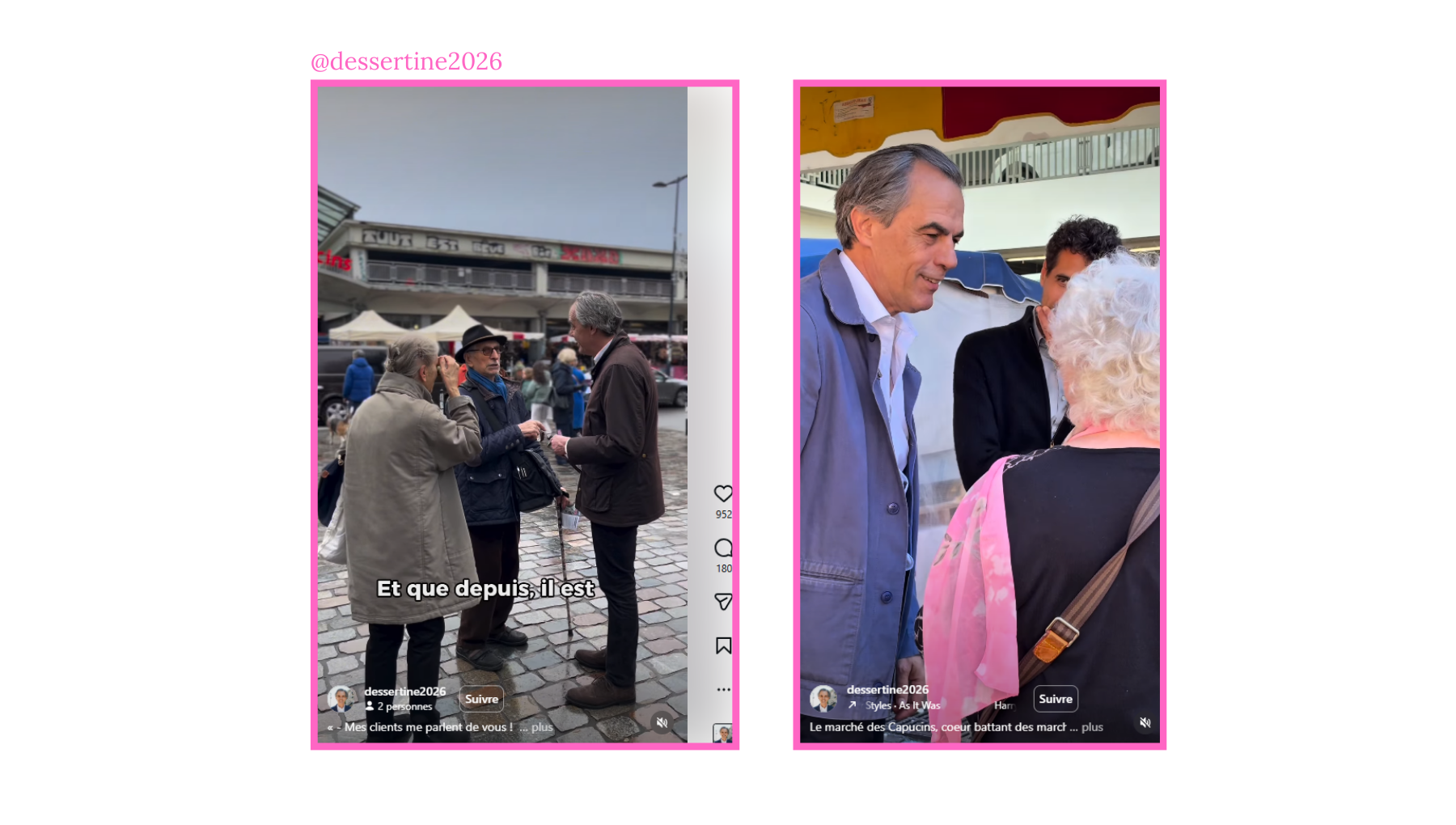 Au moment de notre analyse, @dessertine2026 réalise sa meilleure performance avec une vidéo consacrée à l’insécurité et au trafic de drogue, tournée aux côtés de Danielle Pendanx, présidente de l’association des commerçants du quartier Saint-Paul (513 K vues). Sa deuxième vidéo la plus populaire consiste en un face caméra ironique devant un chantier : il y souligne l’omniprésence du bois, tout en ironisant sur l’interdiction des sapins sur la place de la mairie (165 K vues). Il conclut en présentant ses échanges avec les habitants à propos de son programme. Ces deux vidéos reposent sur des ressorts classiques de viralité sur Instagram : un sujet conflictuel ou polémique d’un côté, et un registre ironique et incarné de l’autre.