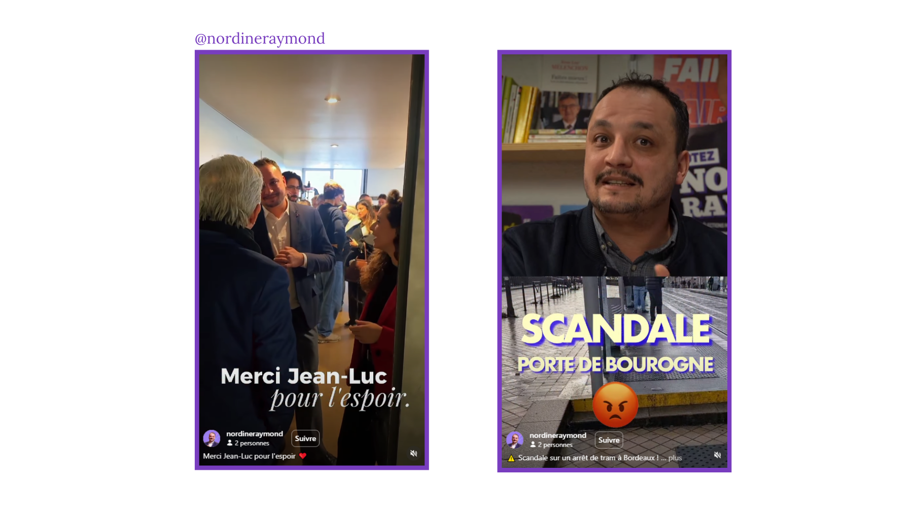 @nordineraymond s’appuie principalement sur des soutiens politiques et militants. Dans notre échantillon de vidéos, les collaborations hyperlocales structurées sont plus rares, ce qui pèse négativement sur son score.