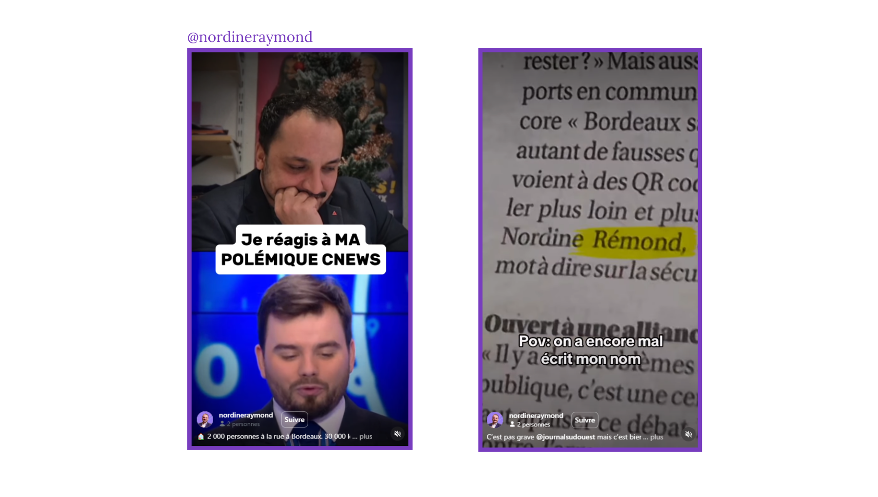 Il s’en prend par ailleurs aux médias (de CNews à Ouest-France) qui écorchent ou se moquent de son nom de famille, en clin d’œil à la campagne de Zohran Mamdani à New York. Raymond publie ainsi un Reel sur une faute d’orthographe à son sujet, accompagné de la musique « My Name Is Mamdani ». Mamdani avait lui-même résumé ce type de pratiques en une formule devenue virale : « Ceux qui font tout pour mal le prononcer, ce n’est pas une erreur, c’est un message. »