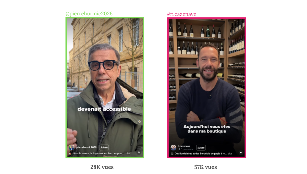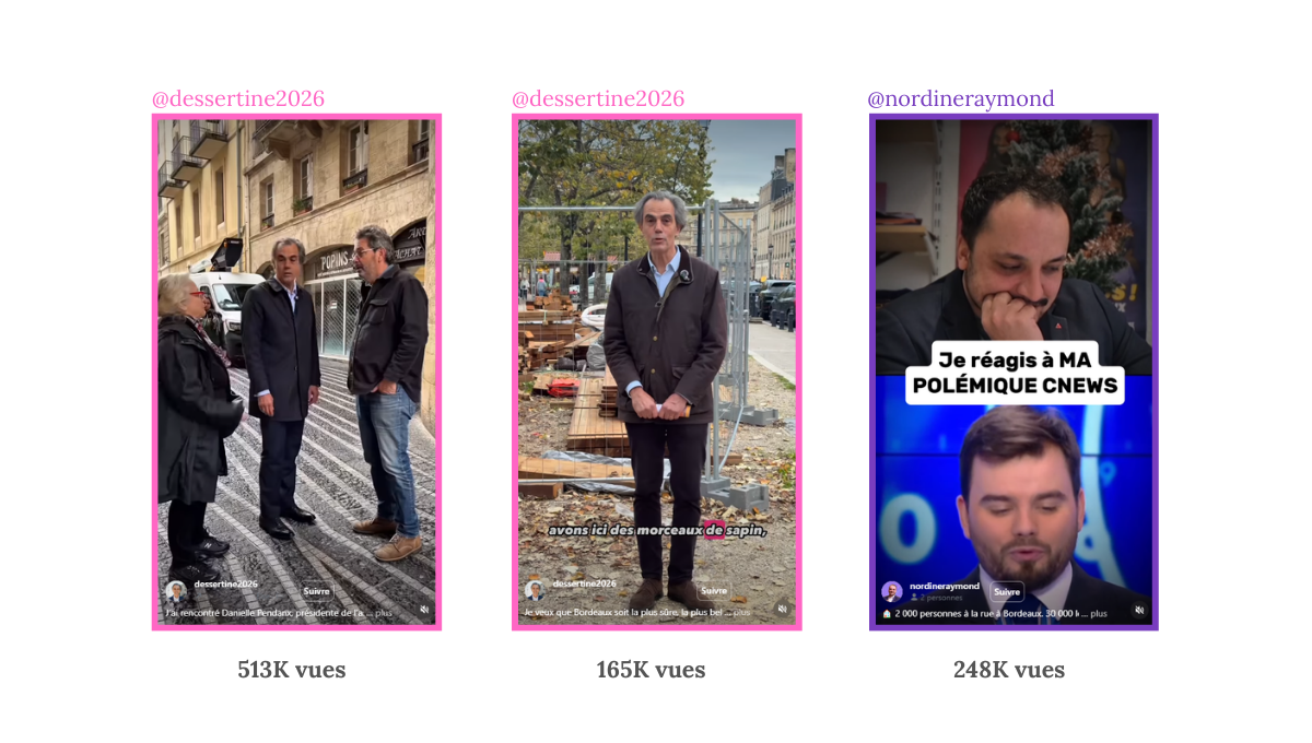 À Bordeaux, la campagne se distingue par des audiences encore modestes sur Instagram au regard de la notoriété politique des candidats. La plateforme est utilisée régulièrement, mais elle ne constitue pas encore un véritable moteur de visibilité politique.