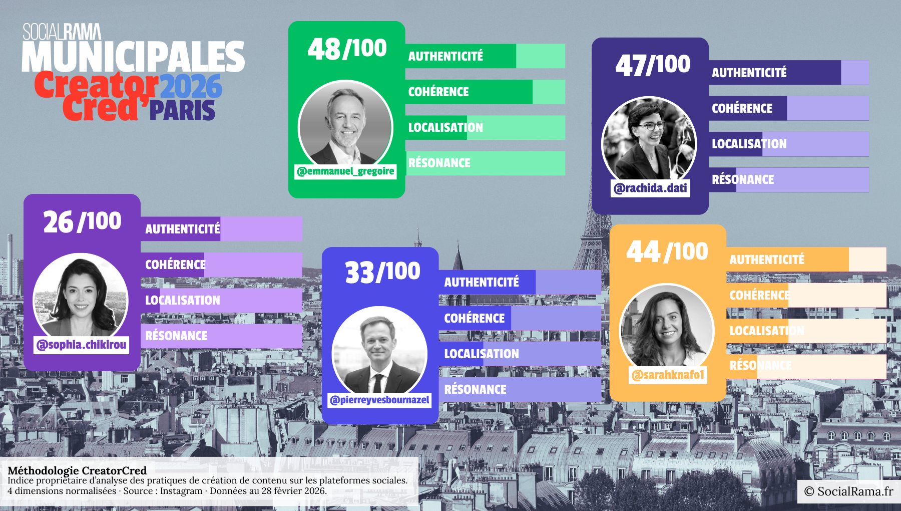 Les élections municipales se jouent aussi sur Instagram : le candidat politique devient un créateur de contenu. À l’approche des 15 et 22 mars 2026, SocialRama a analysé les candidats au prisme de leur CreatorCred', un score exclusif qui mesure leur appropriation des codes des influenceurs.