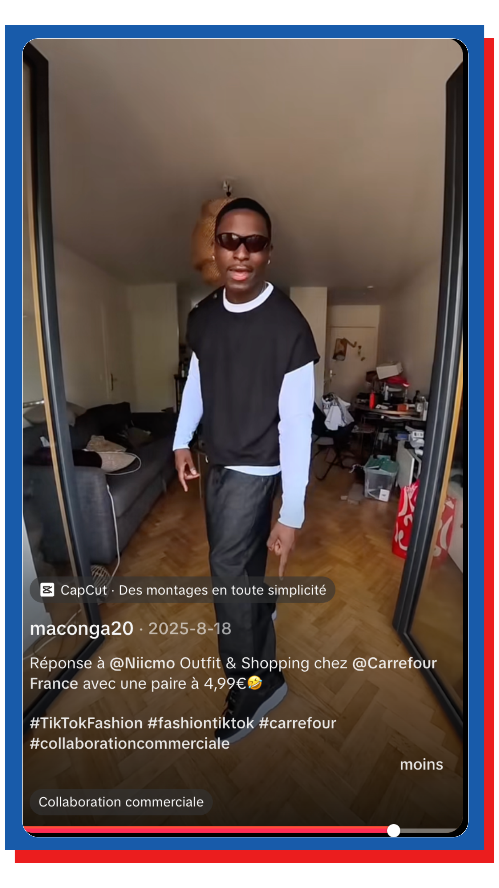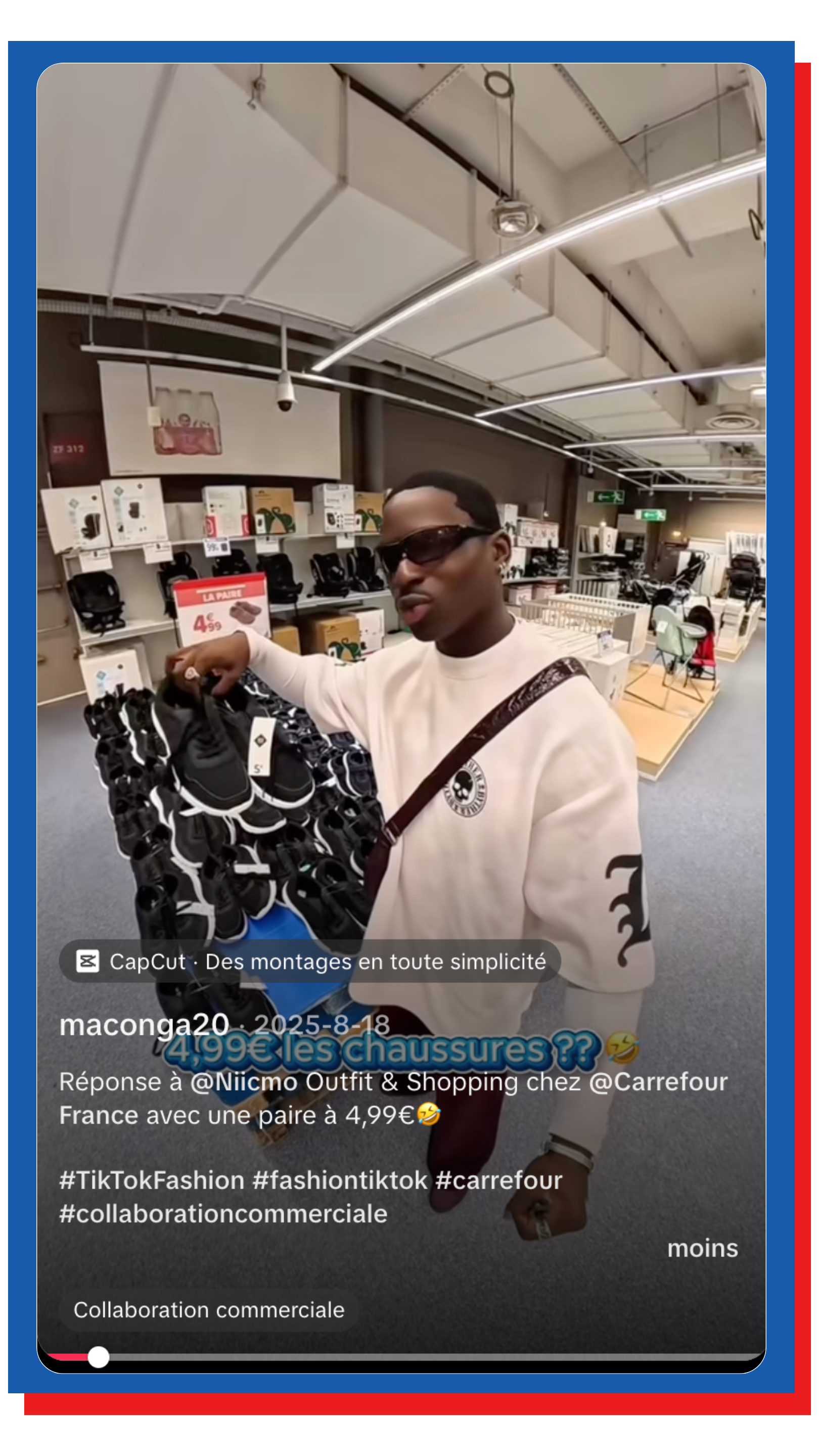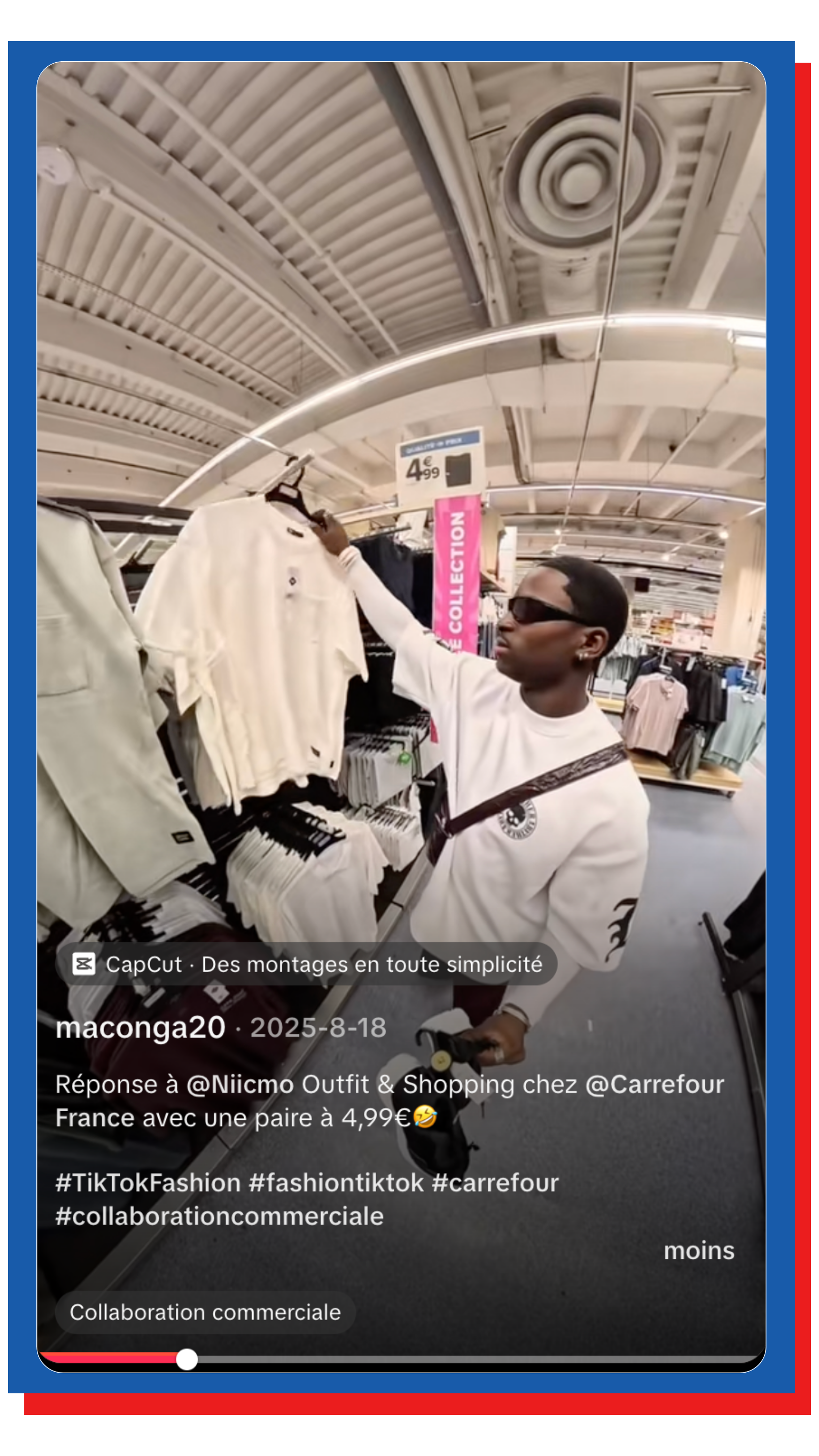 Un des tops performers TikTok avec @maconga20 en shopping chez Carrefour, 10K partages cross plateformes et 400K likes.