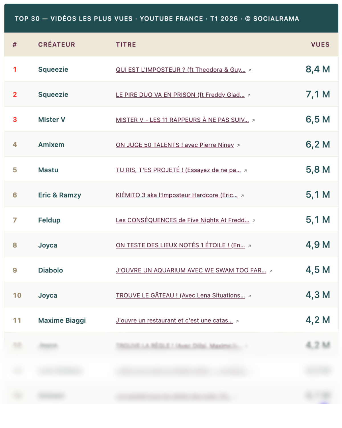 Squeezie survole ce début d'année avec 8,4 millions de vues pour son format « Qui est l'imposteur ? », dominant un Top 30 marqué par les performances constantes d'Amixem et de Joyca. L’analyse révèle toutefois une absence totale de créatrices au sommet du classement et une hégémonie de la banque Revolut, omniprésente côté sponsors.
