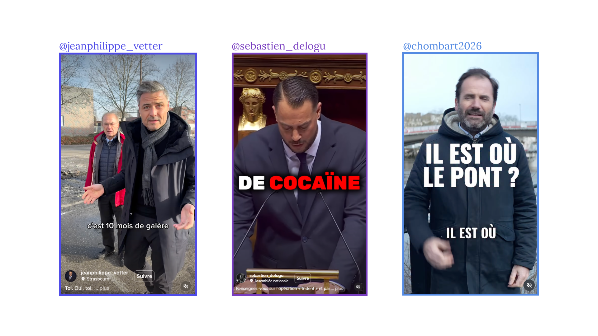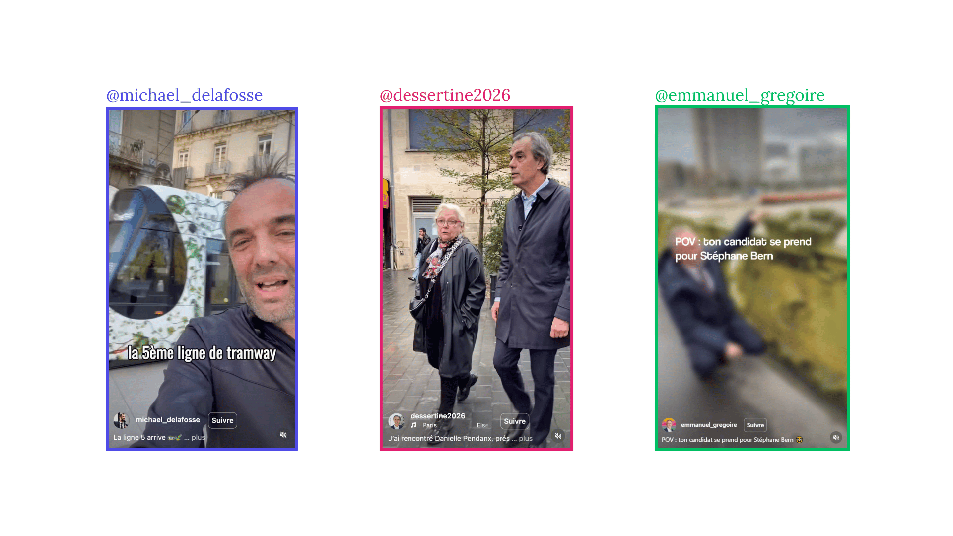 Pour appuyer discours et punchlines, les formats vidéo reprennent toute une identité visuelle de créateur, que ce soit Jean-Philippe Vetter à Strasbourg (face caméra, grosse typo en surimpression, montage nerveux) ou Sébastien Delogu à Marseille, dont le compte fonctionne comme celui d’un influenceur militant national (colorimétrie travaillée, presets CapCut identifiables, lens flares). Foulques Chombart de Lauwe à Nantes incarne une version plus disciplinée du tribun numérique, imposant un axe éditorial cohérent, bien que sa maîtrise du format vertical soit encore en construction.