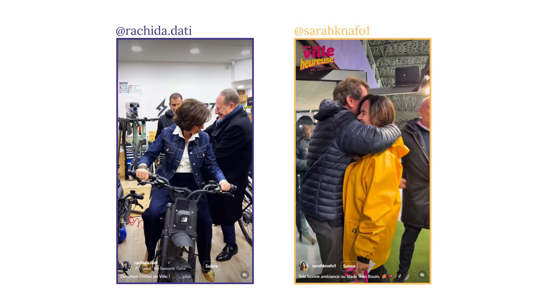 Avec des audiences dignes d’influenceurs, les publications de Rachida Dati ou Sarah Knafo bénéficient d’une portée organique qui n’est atteinte par les autres candidats qu’en cas de viralité exceptionnelle. Rachida Dati obtient d’ailleurs un record absolu dans notre étude : plus de 4 millions de vues sur sa vidéo « Direction l’Hôtel de Ville ! ». Elles ont su utiliser une notoriété préexistante tout en collant aux codes des créateurs, parfois jusqu’à la caricature. Rachida Dati enchaîne les formats typiques de la creator economy, que ce soit avec son « vis ma vie » d’éboueur, ses séquences à vélo électrique ou sa « Dati Story » face caméra. Sarah Knafo pousse l’adoption du playbook créateur plus loin encore, avec une direction artistique calquée sur celle de Mamdani, avec ses polices vintage et sa palette jaune orangée.