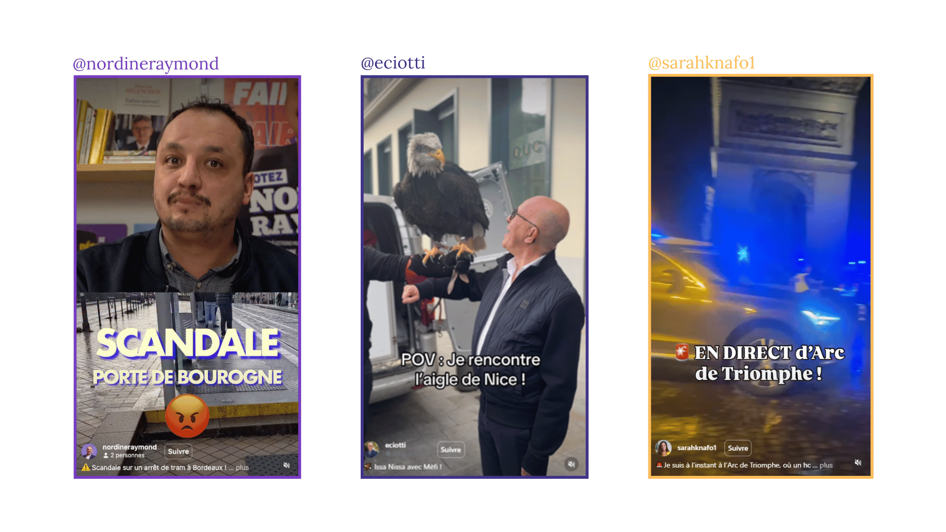 On pourrait enfin mentionner Sarah Knafo qui, bien qu’elle ne soit pas dans cette catégorie, dépasse les 1,8M de vues sur Instagram avec sa vidéo “En direct d’Arc de Triomphe” qui reprend les codes du journalisme embarqué et du direct.