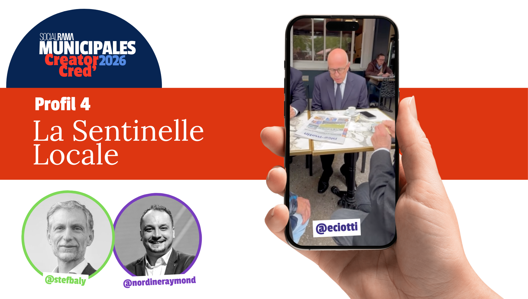 Ce profil maîtrise l'art du format react et de la riposte médiatique. C’est parfait pour générer des pics de visibilité sur des sujets locaux, mais risqué en termes de cohérence éditoriale. Nordine Raymond à Bordeaux dramatise par exemple des éléments locaux sur ses réseaux pour adresser des problématiques nationales comme sa vidéo « Scandale sur un arrêt de tram à Bordeaux » pour parler d’accessibilité et des personnes en situation de handicap. Avec Eric Ciotti à Nice, on a une autre variante de ce profil. Il privilégie des formats courts et peu verbaux empruntés à la grammaire des créateurs (POV avec des boulistes, image dissonante avec l'aigle de Nice sur le bras, séquence baguette en main en voix off), et inscrit son contenu dans un cadre territorial : faits divers locaux amplifiés à l'échelle nationale, tensions internationales traduites en enjeux niçois.