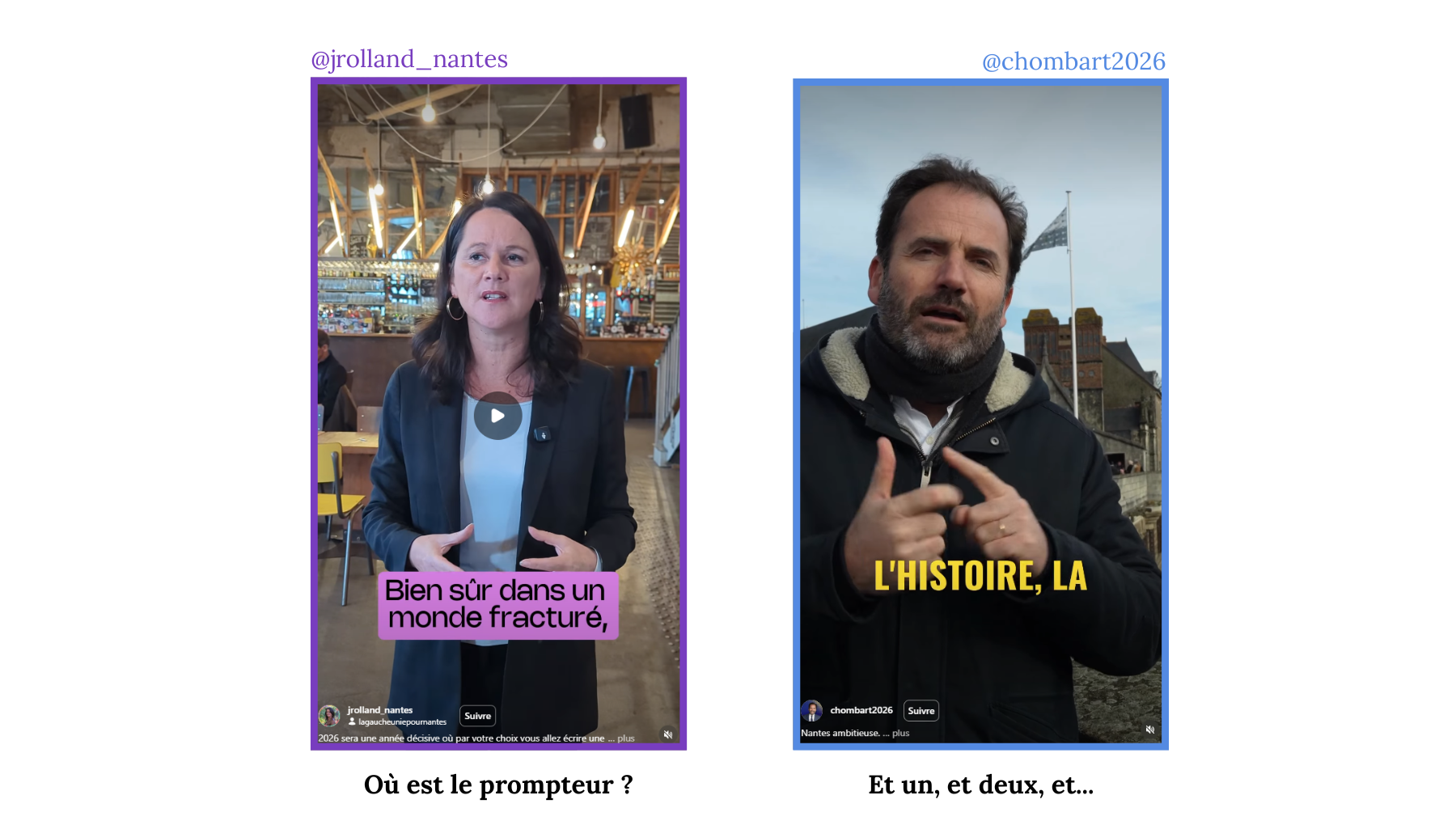 Au palmarès de la résonance, c’est-à-dire des vidéos qui ont obtenu les faveurs de l’algorithme d’Instagram, deux contenus émergent, enregistrant plus de 200 000 vues : une vidéo de @chombart2026 « sur un terrain de foot en forme de haricot impraticable » et une vidéo de la maire sortante @jrolland_nantes, dans un format react au ton ironique, pour contrer les fake news de son rival. Preuve que les clashs font toujours recette chez les influenceurs, même quand ils sont candidats aux élections.
