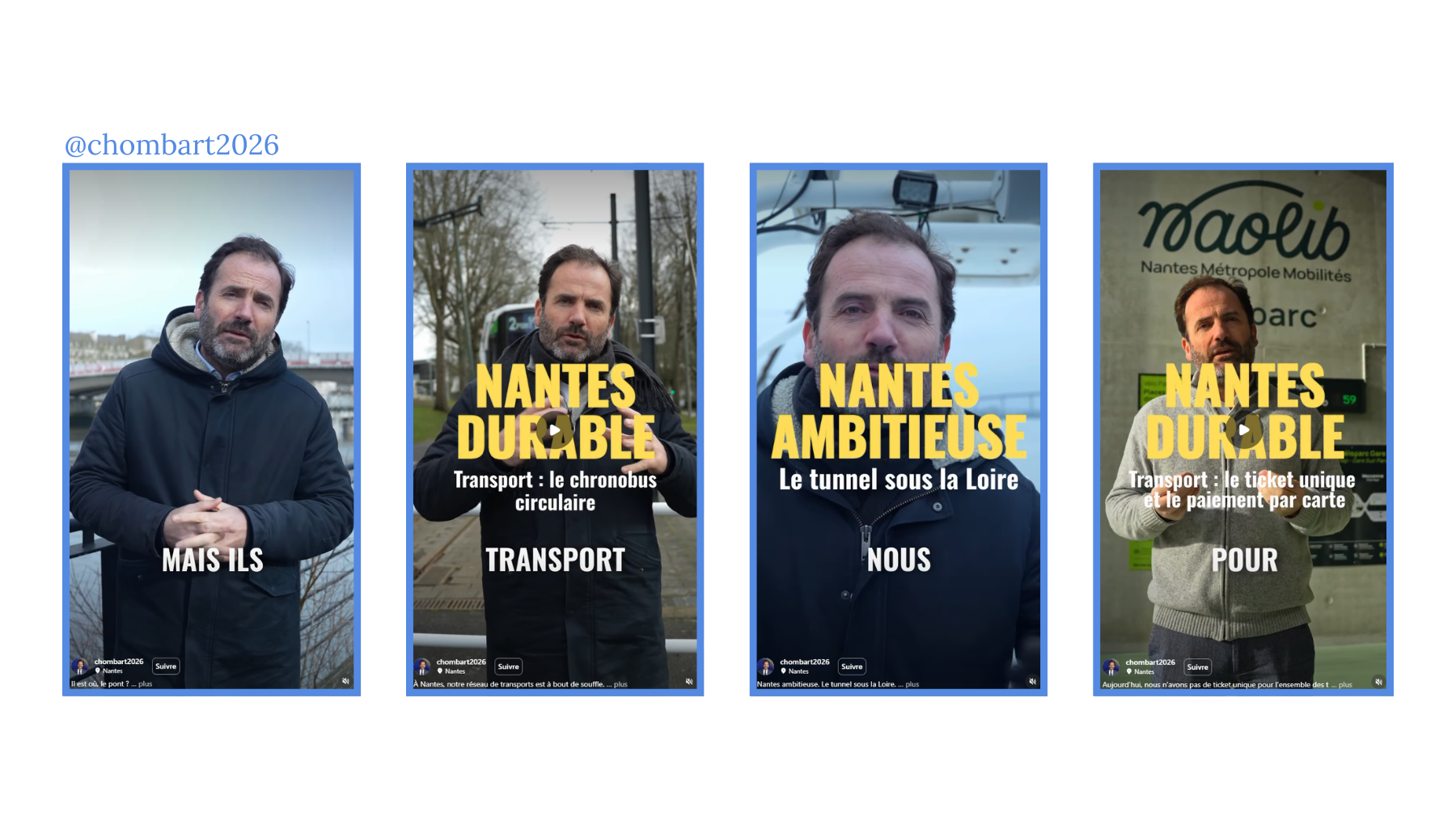 En termes de cohérence, nos candidats maîtrisent leur sujet. @chombart2026 s'en sort le mieux, car il parvient à imposer une thématique au fil de ses différentes vidéos. En priorisant l’axe de la #circulation, des #chantiers et des #transports à Nantes, il décline le sujet en quatre vidéos distinctes et structure son discours autour d’un marqueur fort dans les vidéos les plus en résonance avec cette campagne de néo-créateurs.