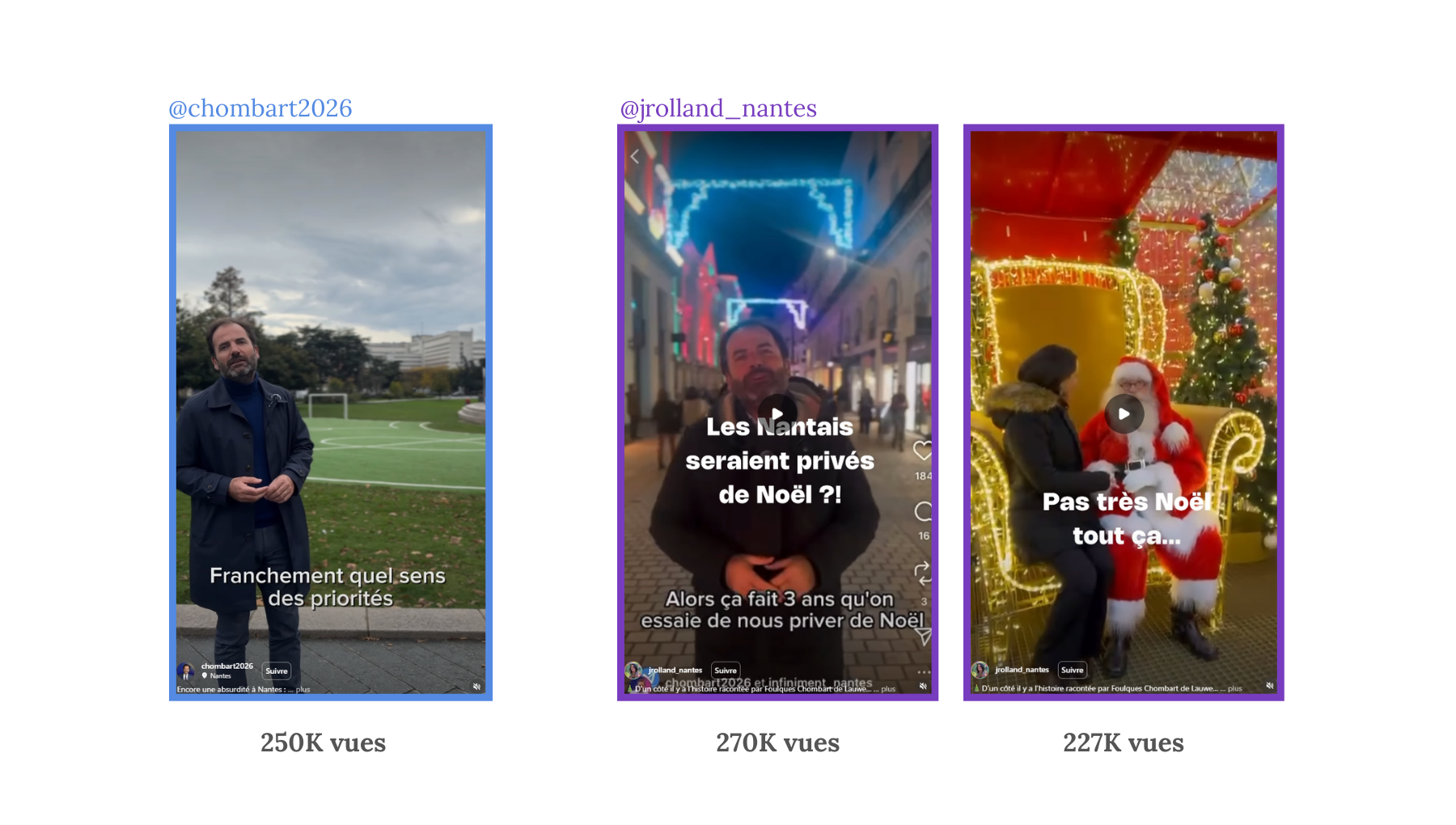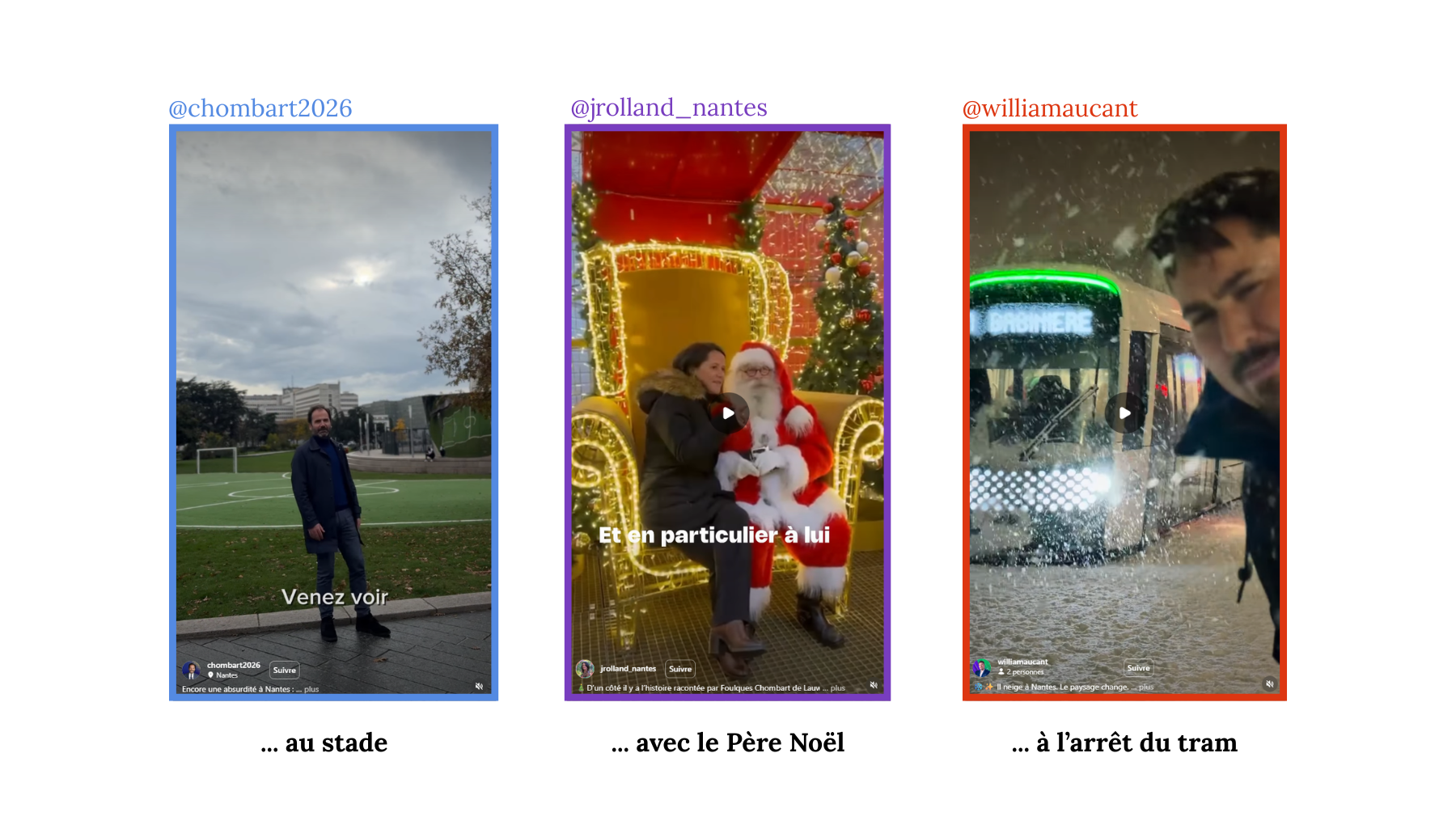 Pour cette analyse, nous avons sélectionné les trois candidats qui se sont mués en influenceurs à Nantes au regard de leur nombre d’abonnés et de leur volume de publications vidéo : la maire sortante, @jrolland_nantes (3 532 abonnés pour son compte de candidate qui n'est pas son compte officiel de maire), @chombart2026 (7 702 abonnés) et @williamaucant (2 437 abonnés).