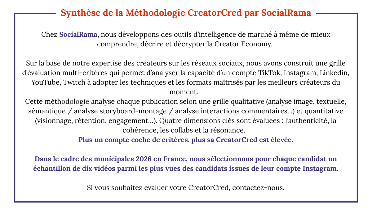 À travers une méthodologie propriétaire, détaillée plus bas, SocialRama analyse la capacité de nos candidats à adopter ce playbook pour bousculer les équilibres politiques en place. Sans jugement sur le fond des programmes, ni analyse politique, mais avec une grille de lecture issue de notre expertise de la creator economy, de l'approche du maire de New York et des mécaniques des réseaux sociaux, nous évaluons leur crédibilité en tant qu’influenceurs en analysant un échantillon de leurs vidéos au prisme de quatre dimensions :