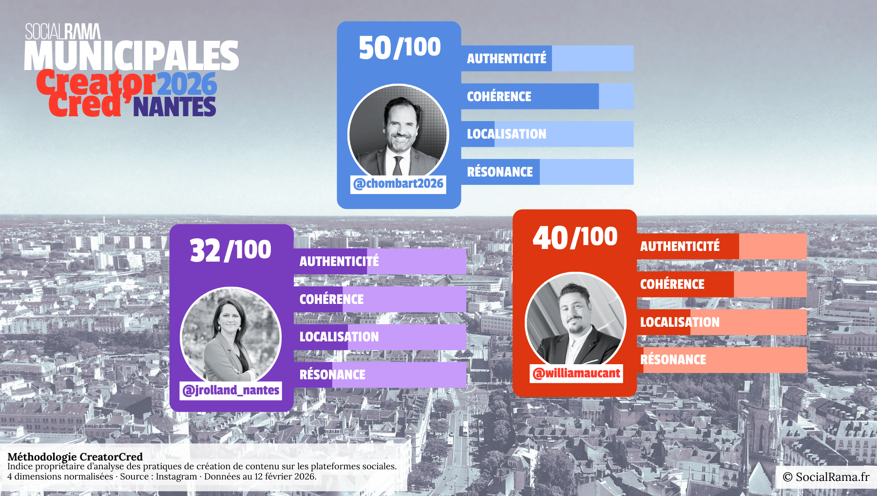 Les candidats nantais ont compris les codes de l'influence, mais peinent à les appliquer au quotidien : les vieux réflexes et les tics médias sont trop présents pour gagner en authenticité. Par ailleurs, la faiblesse des collabs locales tire la note de tous les candidats vers le bas. L’ancrage local des vidéos est pourtant au cœur de l’approche Mamdani et renforce le géociblage des audiences, facteur clé d’une élection locale.