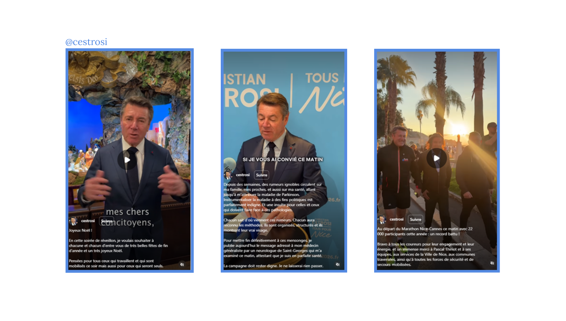 @cestrosi assume une incarnation directe : face caméra à l’église pour Noël, en conférence longue pour répondre aux rumeurs sur sa santé, ou en immersion lors du Marathon Nice-Cannes, il se fait sujet et acteur de ses vidéos. Il parle, explique et détaille. Cette posture descendante renforce la perception d’un maire sortant en fonction. Il bute néanmoins sur sa capacité à sortir du script, accepter l’interactivité et adopter des formats créatifs innovants.