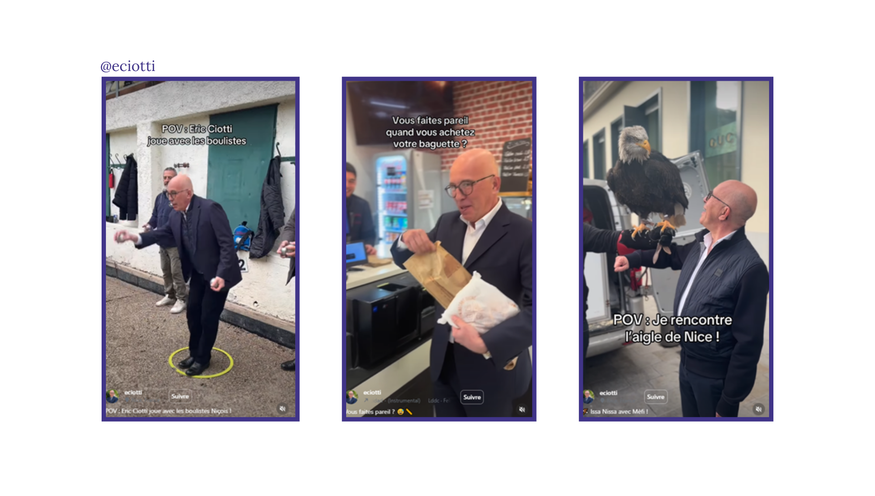 @eciotti au contraire privilégie des formats courts et peu verbaux issus de la grammaire des créateurs : POV avec des boulistes, image dissonante avec l’aigle de Nice sur le bras, séquence baguette en main en voix off. Il parle néanmoins rarement face caméra et utilise des textes brefs, souvent réduits à une phrase. Cette tactique opportuniste renforce l’image d’un candidat ancré dans sa ville mais en oublie alors de délivrer des propositions concrètes pour Nice. Une fois homme politique, une fois influenceur, rarement les deux à la fois, ce qui a pourtant été l’équilibre atteint par Mamdani à New York.