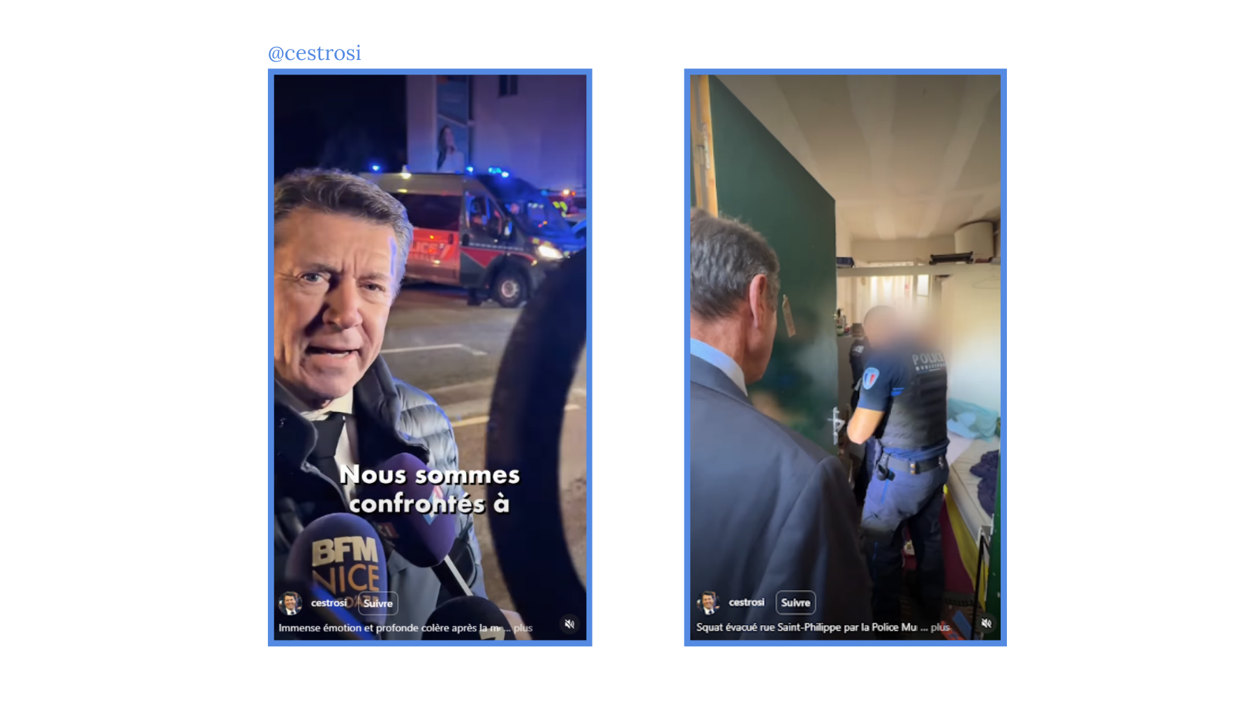 Pour cette analyse niçoise, nous avons sélectionné les deux candidats qui se sont le plus mués en créateurs de contenus au regard de leur volume de publications vidéo et de leur présence régulière sur Instagram : le maire sortant @cestrosi (97 745 abonnés) et son principal challenger @eciotti (84 405 abonnés).