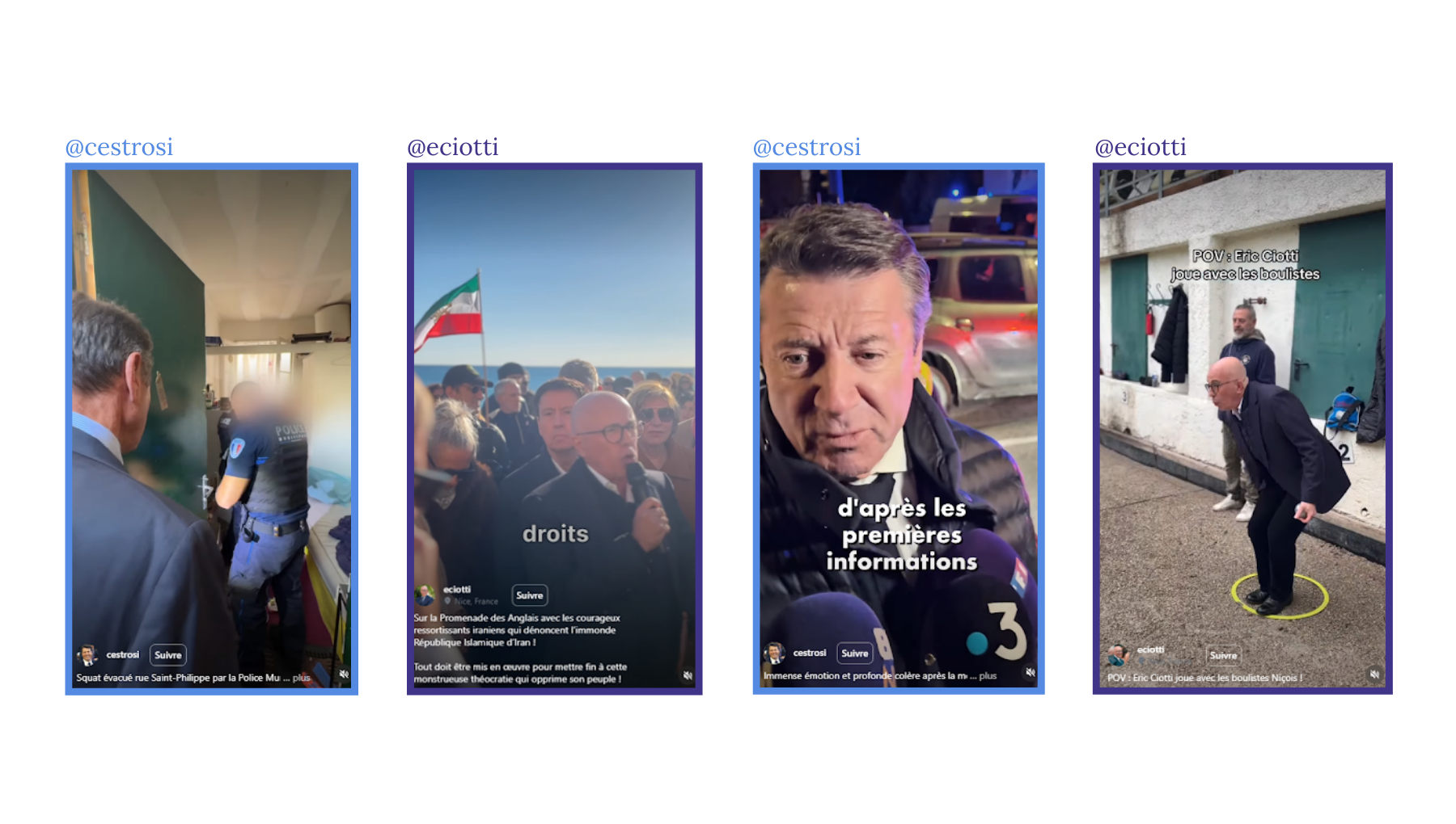 @eciotti mise davantage sur la symbolique : boulistes, militants franco-iraniens sur la Promenade des Anglais, président du Cavigal. La présence locale est réelle mais moins structurée en stratégie de collaboration durable : dans notre corpus de vidéos analysées, aucune n’avait été réalisée avec des influenceurs locaux.