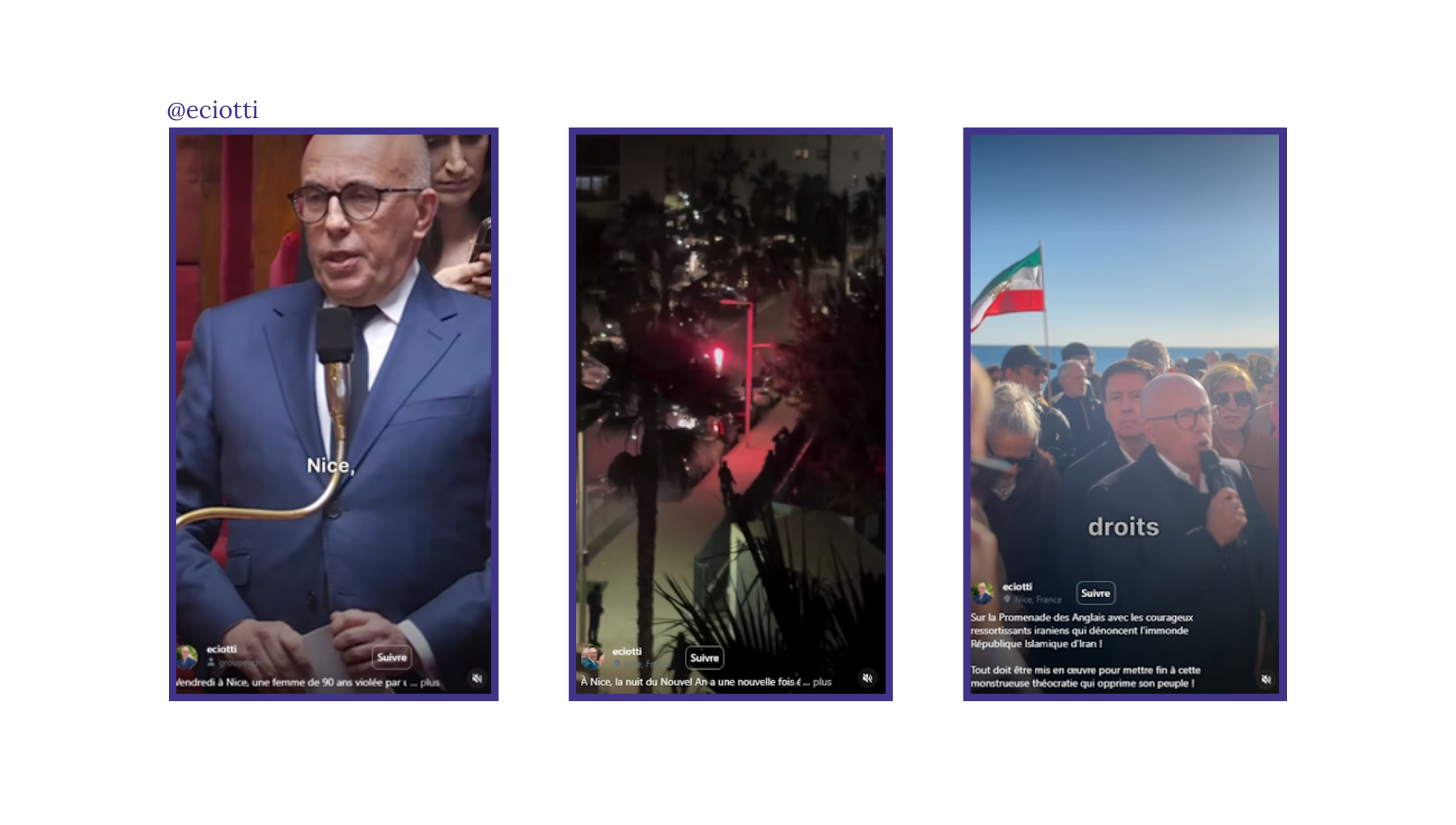 De son côté, @eciotti s’appuie fréquemment sur des faits divers locaux qu’il amplifie à l’échelle nationale, mais aussi sur des tensions internationales qu’il traduit en enjeux locaux. Chez @eciotti, la tonalité sécuritaire domine (qu’il s’agisse du viol commis sous OQTF à Nice ou des violences du Nouvel An dans un quartier de Nice), et les registres local, national et international s’entremêlent : fait divers à Nice évoqué à l’Assemblée nationale, participation à une manifestation sur la Promenade des Anglais en compagnie de franco-iraniens sur la situation en Iran, etc. Ce mélange s’explique par sa double posture de député et de candidat à un mandat local.