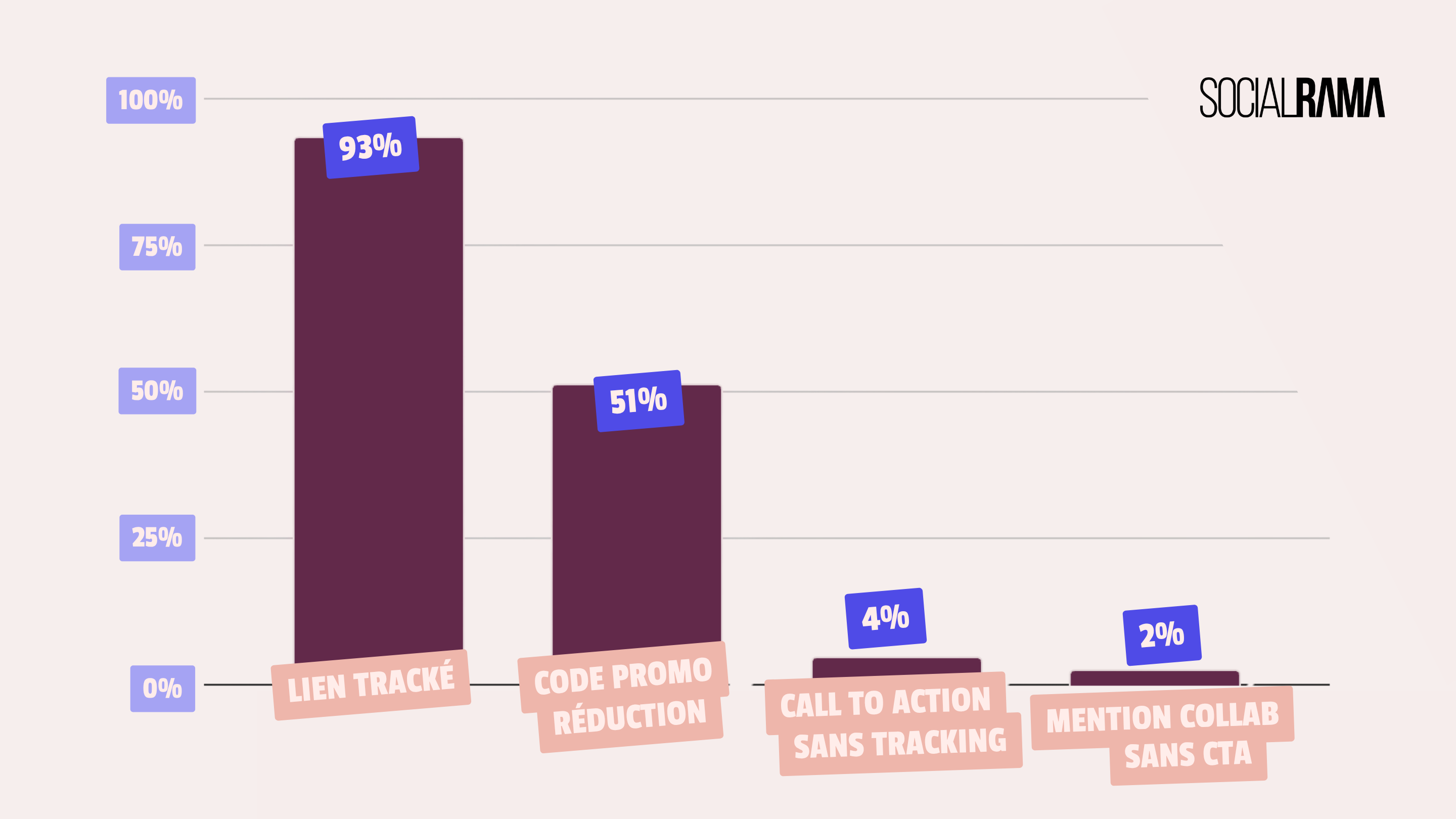 Et 51 % des collaborations commerciales utilisent un code promo (« Utilisez le code HUGO pour avoir -10 % sur tout le site »). Des formes de call to action très orientées bas de funnel marketing.