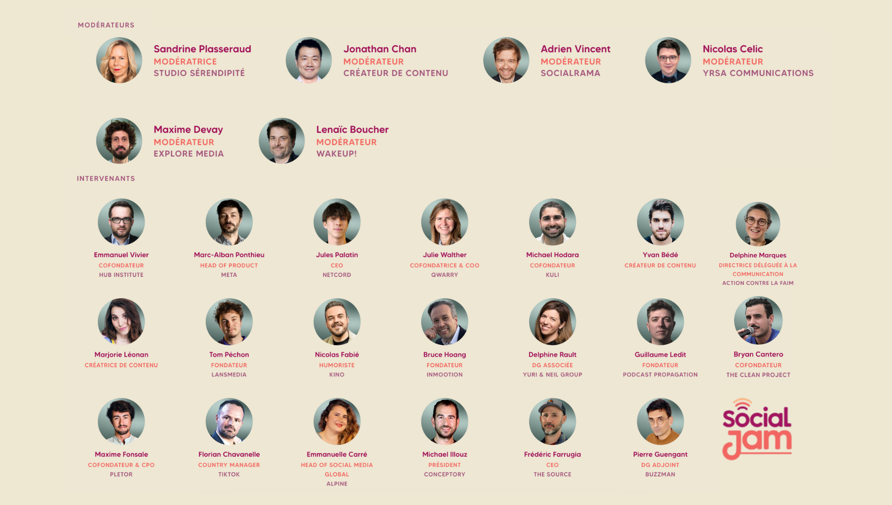 +++ Deux Jam Live interactifs rythmeront la journée. Bruce Hoang, l'un des acteurs de la transformation digitale d'Orange des dernières années, explorera le rapport au mouvement et à la reconnexion au corps à l’ère digitale. Kino, humoriste et créateur, l'un de nos chouchous chez SocialRama, décryptera les ressorts de la viralité post-algorithme.